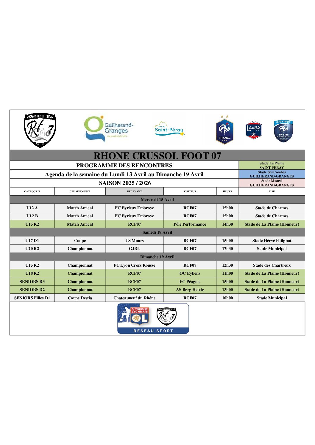 Voici le programme de la semaine pour nos équipes du RCF07 !